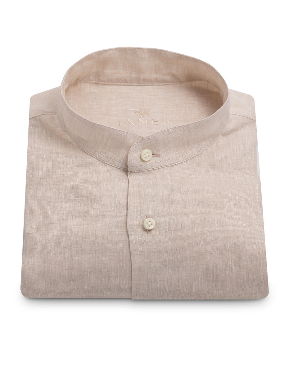 Novinka z kolekce JARO/LÉTO 2024. Tato béžová lněná košile se vyznačuje hlavně tím, že její stojáček límce je bez jeho špiček. Límec Band zažívá comeback u volnočasových a obzvláště letních košil, jako je právě tato. Košile je ze 100% lnu od českého výrobce látek Mileta. Bílé perleťové knoflíky z mořských lastur jsou krásným doplňkem této košile.