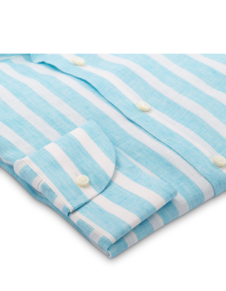 Tato světlá modrobílá lněná košile se vyznačuje hlavně tím, že její stojáček límce je bez jeho špiček. Límec Band zažívá comeback u volnočasových a obzvláště letních košil, jako je právě tato. Košile je ze 100% lnu od českého výrobce látek Mileta. Bílé perleťové knoflíky z mořských lastur jsou krásným doplňkem této košile.