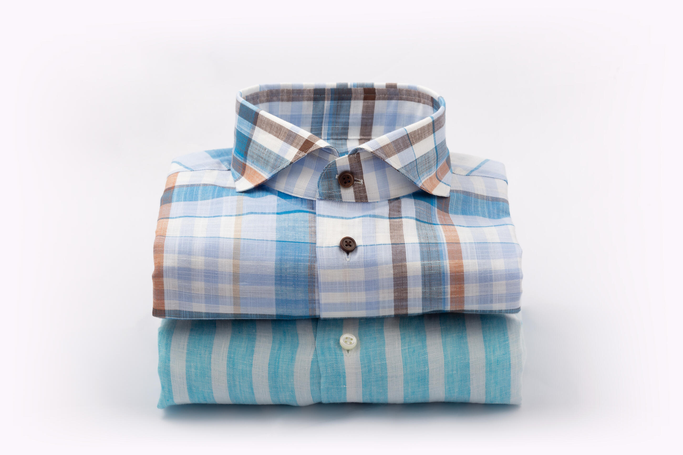 Tato světlá modrobílá lněná košile se vyznačuje hlavně tím, že její stojáček límce je bez jeho špiček. Límec Band zažívá comeback u volnočasových a obzvláště letních košil, jako je právě tato. Košile je ze 100% lnu od českého výrobce látek Mileta. Bílé perleťové knoflíky z mořských lastur jsou krásným doplňkem této košile.